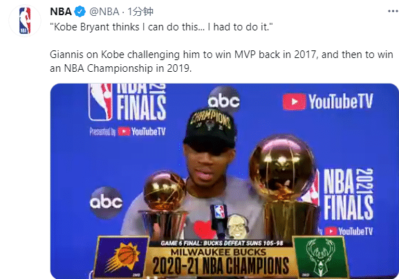 字母哥还回应完成科比定下的FMVP目标,他表示:科比认为我可以做到,我就一定要做到,我必须努力训练,我不想让科比失望,这也是我留在雄鹿的原因,我不想让他们失望。