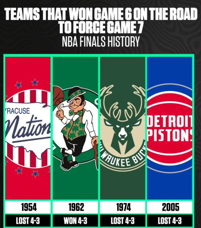 不过,NBA是奇迹诞生之地,没有任何事情是绝对的。就像2016年总决赛,骑士也是创造奇迹成为历史首支1比3落后完成翻盘的球队,这也是NBA最大的魅力所在。实际上,在总决赛历史上,此前发生过4次客队在G6赢球并把系列赛拖入到抢七大战。