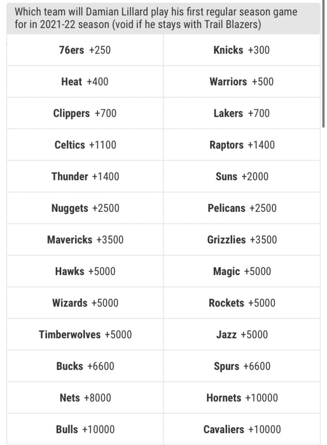 利拉德在2021-22赛季的首场常规赛,将身披哪支球队的球衣(如果他留在开拓者则作废)?最新赔率显示,领跑的是费城(+250),而尼克斯(+300)紧随其后。位居第三的是热火(+400),第四是勇士(+500),快船和湖人同为(+700),并列排名第五。
