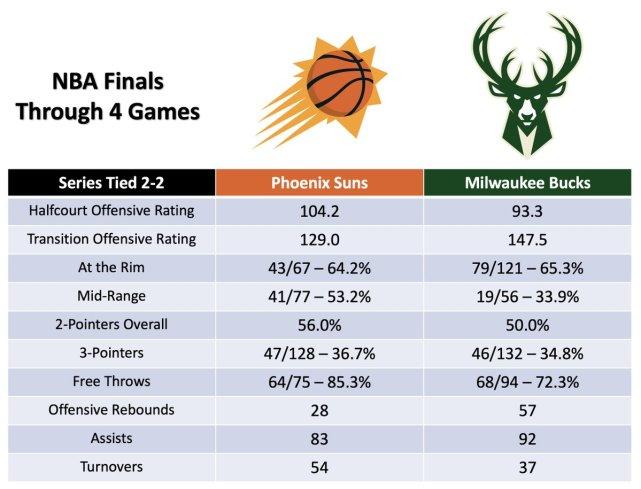 360直播讯北京时间7月17日,雄鹿和太阳已经打过4场总决赛,战成2-2平。名记肖恩-杨晒出了前4场比赛的高阶数据对比,双方各有占优势的数据,但雄鹿在前场篮板和快攻方面的效率令人印象深刻。