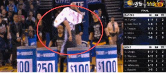 此时有趣的一幕出现了,一个拿着毛巾蒙着头的家伙,突然冲出来,抓住了空中的球,把它扔进了5000美元的桶里面,随后又迅速的转身来到教练的身边听取战术,似乎这一切根本没有发生过,这个家伙就是斯蒂芬库里。
