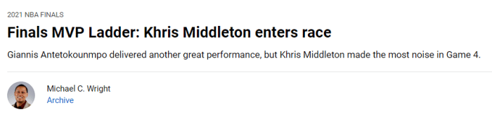 显然,字母哥在总决赛连续发挥都十分稳定,如果雄鹿真能赢下总冠军,FMVP应该就是字母哥的。米德尔顿通过总决赛G4的大腿级表现,确实让他得到了FMVP排名上升的优势,与之相反的则是保罗,而布克在排名上不如字母哥和米德尔顿,大概率是保罗表现低迷导致太阳夺冠前景不被看好吧。