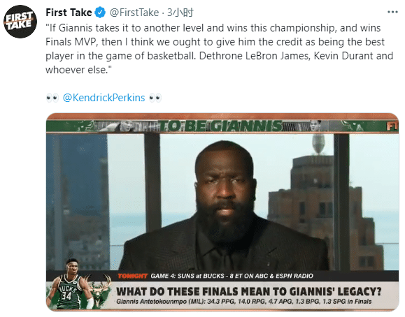 360直播讯 雄鹿和太阳总决赛G4开打之前,名嘴帕金斯又狂吹字母哥,他在节目中直言:如果字母哥今年能够赢得总冠军和FMVP,那么我们应该承认他将超越詹姆斯和杜兰特成为联盟最好的球员。