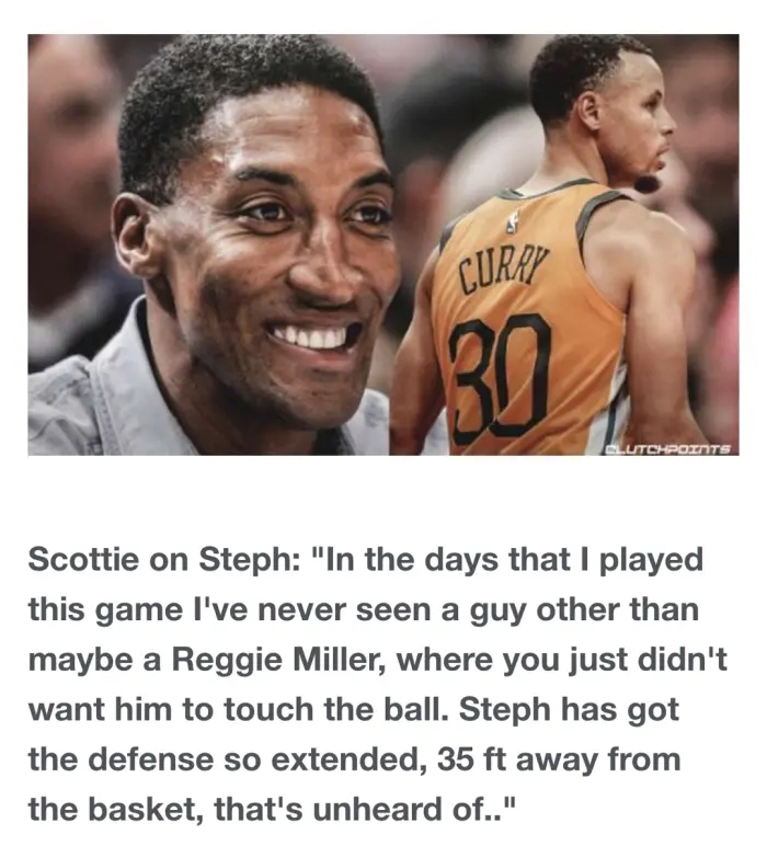 他为库里改变联盟打球的方式而惊叹“没人敢想象自己能够追赶上库里的步伐。看看他投三分的方式吧,那感觉就像他在上篮一样。他改变了这项比赛,我不觉得还有其他球员可以这样改变联盟的蓝图。在我打球的那个年代,我从来没见过像库里这样的球员,可能除了雷吉-米勒,但雷吉-米勒控球技术远不如库里。你根本不想让这样的球员接到球。库里让距离篮筐35英尺的距离都成为他的攻击范围,在我的那个年代,简直是闻所未闻。他如果回到90年代打球,会让所有人惊掉下巴,我能想象乔丹也会惊叹”