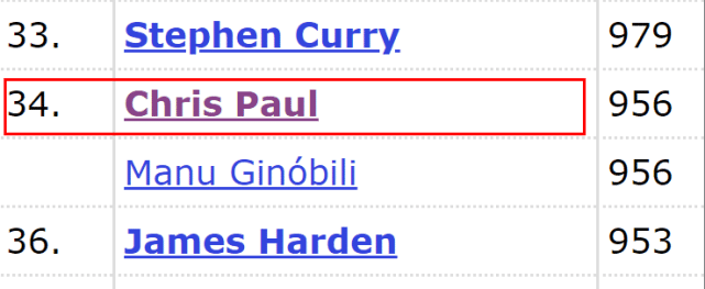 第二,保罗的季后赛总进球数已经达到956个,和吉诺比利并列在历史第34位。上一场比赛,保罗的进球数超过哈登,追平吉诺比利,而在G4的比赛中,保罗将超过吉诺比利,下一个追赶目标是库里(979个)。