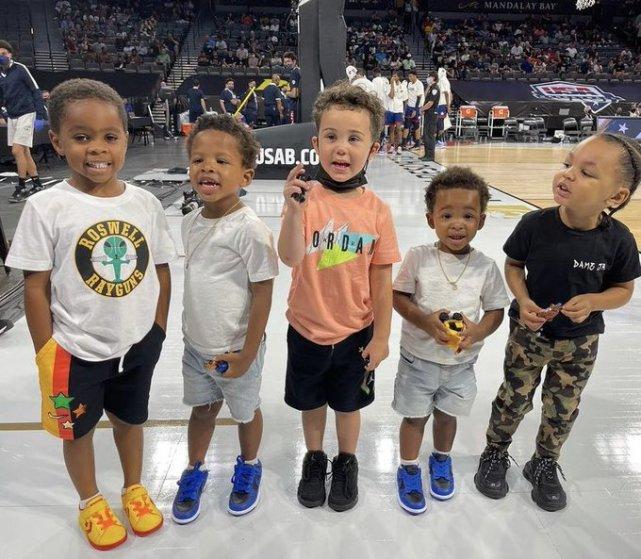左起第一位是德雷蒙德-格林的儿子,是不是颇有几分格林的气质,从长相来看,真的相当像了。左起第二位和第四位都是比尔的儿子,中间这位经常曝光,他是塔图姆的儿子Deuce,而最右边的这位是利拉德的儿子,他的T恤上也有Dame JR的字样,就是小达米恩。