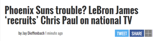 360直播7月14日讯 湖人球星勒布朗-詹姆斯参加了《吉米鸡毛秀》,引起球迷热议。在节目中,主持人询问了詹姆斯是否期待和保罗联手的话题,而詹姆斯连用三个“绝对的”表明了自己的心意。美媒的标题是:太阳的麻烦来了?勒布朗-詹姆斯在国家电视台“招募”克里斯-保罗。