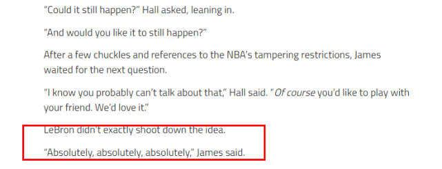 谈论这样的话题,詹姆斯肯定要冒着被罚款的风险。主持人说:“我知道你可能不能去谈论这个,当然你想跟你的朋友一起打球,我们也想看到。”詹姆斯微笑着回应道:“绝对的,绝对的,绝对的!”他没有挑明,但三个“绝对的”已经说明了一切。