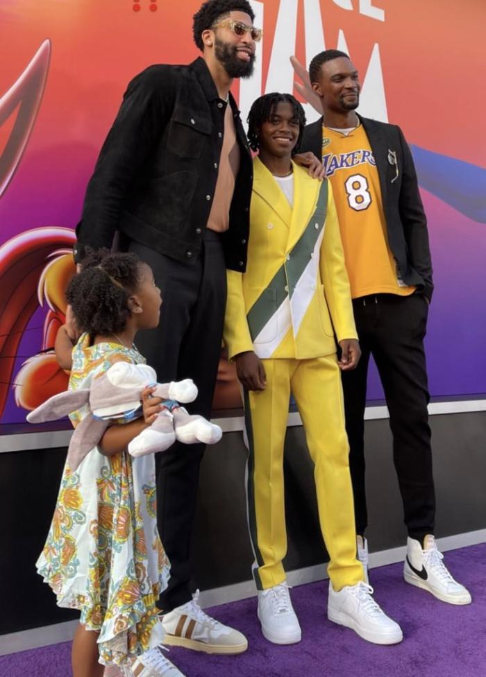 浓眉身穿休闲装搭配一副时尚的眼镜,带着老婆、孩子也来到了现场,他也参演了这部电影;不仅和詹姆斯紧紧拥抱,而且浓眉一家三口和波什合影留念。