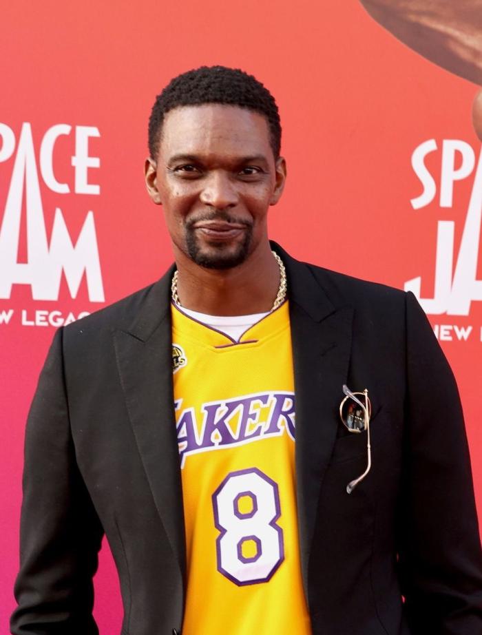 波什身穿湖人名宿科比8号球衣亮相,搭配一件黑色西装,他和詹姆斯见面后,两人紧紧拥抱十分亲密,之后两人对着镜头合影留念;波什还在活动现场展示科比的8号球衣,现场观众为他欢呼。