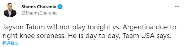 360直播7月14日讯 ,美国男篮和阿根廷热身赛开打之前,名记shams报道,美国男篮官方宣布,由于右膝酸疼,凯尔特人球星塔图姆将因伤缺席本场比赛,被列为每日观察名单之中。