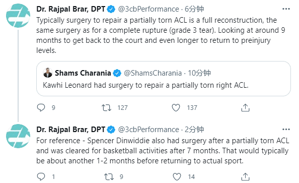 今年季后赛,快船队史首次杀进西决,可是小卡受伤缺席西决全部比赛,最终快船2-4被太阳淘汰出局;小卡归期未定,据医学专家Rajpal透露,小卡至少伤停9个月,他发推:修复韧带部分撕裂和完全破裂(3 级撕裂)的手术相同。大约需要 9 个月才能回到球场,甚至需要更长时间才能恢复到伤前水平。