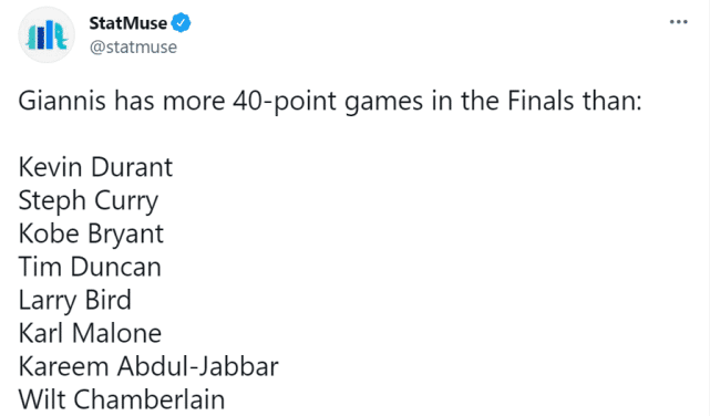360直播讯 北京时间7月13日,在总决赛第三场20分大胜太阳后,目前雄鹿大比分1比2落后太阳。字母哥过去两场表现不可思议,连续两场送出40+10。在总决赛两次砍下40分,字母哥目前并列历史第7,仅次于杰里韦斯特、詹姆斯、乔丹、奥尼尔、贝勒、里克巴里。而杜兰特、库里、科比、邓肯、拉里伯德、卡尔马龙、贾巴尔、张伯伦这些历史级巨星,在总决赛都是仅仅只拿过1次40分。