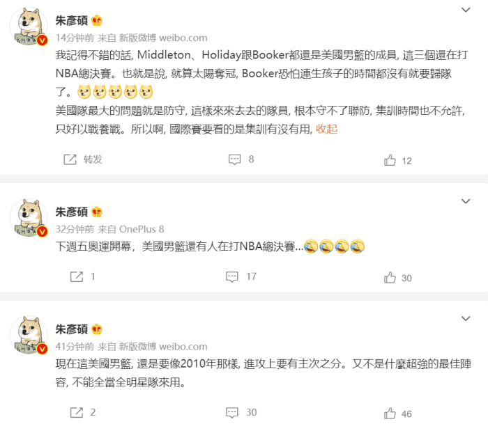 谈到这场比赛国内的几大名嘴也给出了自己的观点,宝岛名嘴朱彦硕跟我说的差不多,磨合时间短没时间集训,只能以赛代练!杨毅强调这支美国队没有防守,没法打最擅长的攻守转换,40分钟的比赛丢90多分,自己守不住没法打快攻,落入阵地又没有配合,这样打到国际赛场不好使!