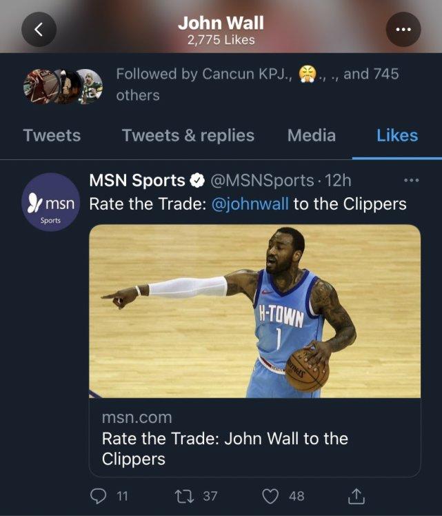 360直播讯 北京时间7月13日,外媒建议快船和火箭进行一笔4换1的交易,快船送出马库斯-莫里斯、贝弗利、朗多和肯纳德,得到火箭的后卫约翰-沃尔。有趣的是沃尔本人在社媒上点赞了这笔交易方案,引起热议。难道沃尔想去快船联手小卡和乔治?