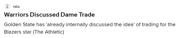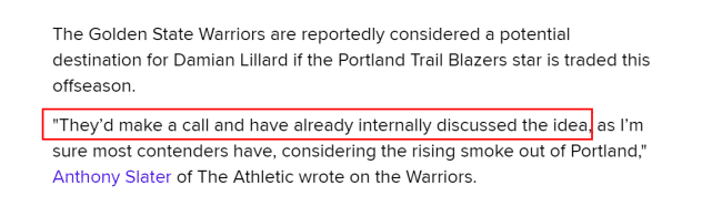 360直播讯 北京时间7月13日,据The Athletic的勇士记者安东尼-斯雷特报道,勇士已经在内部讨论了交易利拉德的想法,并会给开拓者打电话。斯雷特表示,考虑到利拉德目前在开拓者的现状,大部分球队都会这么做。The Athletic还报道称,预计多支球队会询价利拉德。如果利拉德可以被交易,除了勇士,费城、尼克斯、猛龙这三队也有实力给出不错的报价,成为主要竞争者。