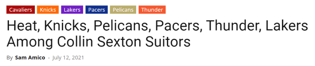 360直播讯 北京时间7月13日,据名记萨姆-阿米克报道,消息源透露,热火、尼克斯、鹈鹕、步行者、雷霆和湖人队都在评估塞克斯顿的交易。此前有消息称,骑士已经将22岁的新星塞克斯顿摆上货架。