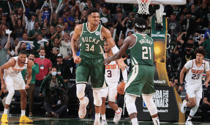 除了字母哥之外,霍勒迪和米德尔顿也找回最佳状态,在总决赛G2中,他们两人变成铁神,合计只有37投12中,而回到主场之后,两大巨星28投14中合砍39分,为字母哥提供足够的火力支持,最终,雄鹿取得一场大胜。所以,雄鹿的胜负晴雨表不是字母哥,而是霍勒迪和米神。