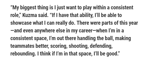 库兹马在接受采访时直言:“我每个休赛期都会提高,为自己增加新技能。我已经把自己变成了一个出色的放手做,新秀赛季我甚至没办法阻挡任何人,但是现在我能防守四个位置,我知道我可以用防守影响比赛。”谈到自己在球队中的地位,库兹马明显不满:“对我来说最要紧的是确定场上角色,我想施展我真正的能力。在我生涯里,当我被给予足够多的发挥空间时,你会看到我的效率,我的得分,我的防守。我不想只做一名底角射手。”