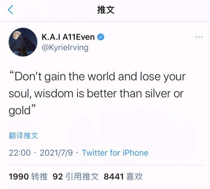 欧文在社交媒体中这样说道,他告诫网友们不要为了全世界而出卖自己的灵魂,因为智慧远比金钱更加重要。这段话让不少球迷都摸不着头脑,因为这实在是太高深了,恐怕一般人也很难明白这段话的意思,其实欧文已经不是第一次在社交媒体上发布这些耐人寻味的话了,而这一次发布的动态也是让不少网友为其转发,很多人可能都觉得欧文这句话其实是有点道理的。相比起杜兰特在社交媒体上天天和网友互喷,欧文也算得上是一股清流了。
