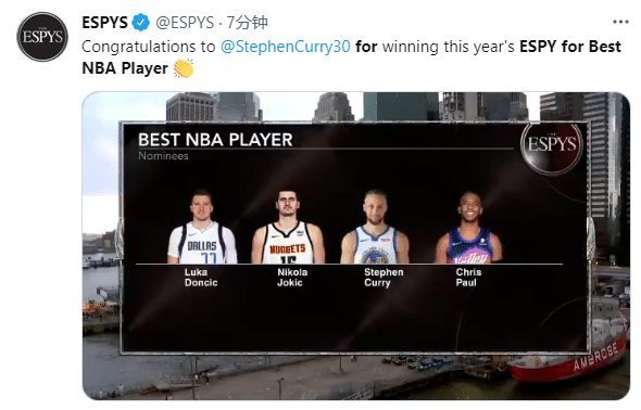 勇士官方第一时间恭喜库里,发推写道:球迷们可以发声了,这是库里职业生涯第二次荣获ESPY最佳球员大奖;恭喜库里,勇士 官方还发推:库里是2021年ESPY最佳球员得主吗?除了库里还能有谁。