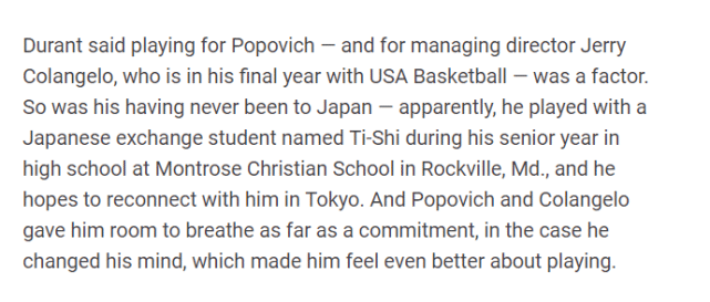 为美国男篮夺取金牌,当然是首要的因素,但杜兰特还提到了两个让他下定决心参加奥运的原因。其一,是他想为波波维奇打球,想为美国男篮主管科朗吉洛效力,这也是后者最后一次为美国男篮工作。其二,是杜兰特的私人原因。他告诉记者,自己从未去过日本,但在高中时曾和一位日本交换生Ti-Shi玩在一起。他希望能去东京和这位朋友重新建立联系。