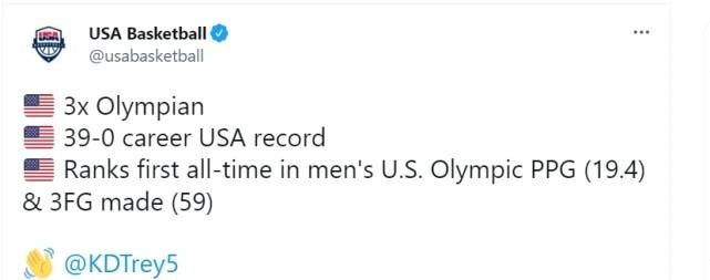 三天前,美国男篮曾晒出杜兰特的国家队履历:“第三次参加奥运会,美国国家队生涯39胜0负,场均19.4分,累计命中59记三分球,都排在美国男篮队史第一,@凯文-杜兰特。”波波维奇也调侃杜兰特若是不参加奥运,自己会哭着去求。作为本届美国男篮的头号球星,杜兰特也出现在国际篮联的海报上。