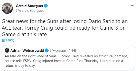 克雷格膝伤并不严重,名记Gerald Bourguet发推:萨里奇惨遭前交叉韧带撕裂之后,这算是一个好消息,克雷格可以在总决赛G3或者G4复出。