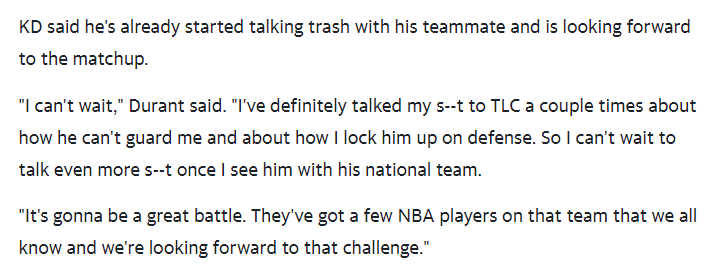 美国男篮奥运会揭幕战对阵法国男篮,杜兰特表示:我非常期待这场战斗,我已经开始向鲁瓦乌说垃圾话了,我和鲁瓦乌谈过好几次,他防不住我而我可以防死他,我迫不及待地想和他在比赛中说更多垃圾话,特别是当他跟他的国家队队友在一起的时候。