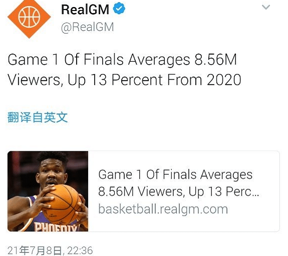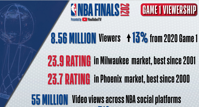 不过很显然球迷们的担心是多余的,总决赛G1的收视率出炉,首战的收视率相比起上赛季,上涨13%,ABC的收视人数是856万,去年湖人和热火的G1是750万左右。同时总决赛第一场,雄鹿大本营密尔沃基的收视率是23.9%,20年来新高;菲尼克斯当地的收视率是23.7%,21年来新高的数据。同时官方数据显示,一共有5500万人次通过NBA的各种平台收看了总决赛G1的录像和集锦,相较2019年上涨了71%;