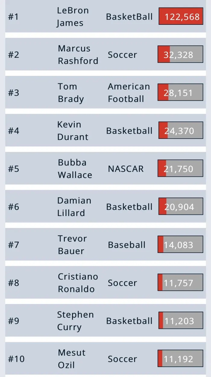 360直播讯 北京时间7月9日,《今日美国》报道,一项由体育统计网站Pickswise获取的研究数据,在过去一年中体育运动员在推特上被骂次数的排行榜(从2020年6月到2021年6月)
