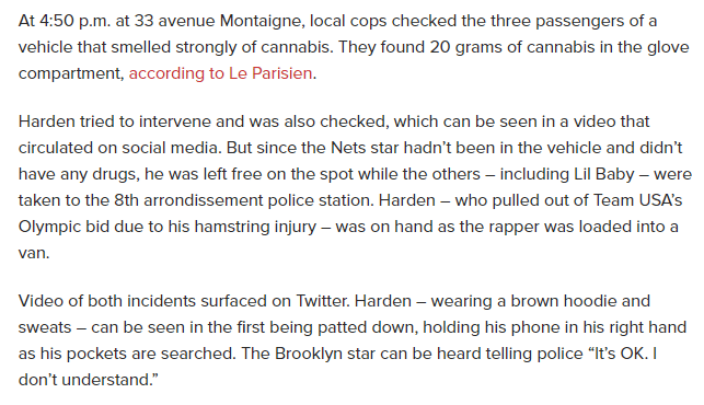 据《纽约邮报》报道,当时时间下午4点50分,在巴黎蒙田大道上,当地警察巡逻过程中闻到哈登同伴的车中有强烈的大麻味,随即对其进行检查,最终搜出20克大麻;哈登试图干涉此事,也被警察搜身,最终由于哈登未携带大麻且当时不在车上,未被逮捕;包括说唱歌手Lil Baby在内的另外两人被逮捕带走。