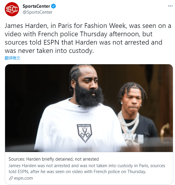 360直播讯 北京时间7月9日,据多家美媒报道,在法国巴黎街头,由于同伴的车内藏有大麻,哈登遭当地警察搜身检查,所幸他本人没有携带任何大麻而且当时不再车内,最终未被逮捕;而哈登好友Lil Baby则被警察逮捕,并且被拘留。