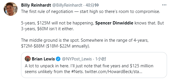 对于丁威迪的续约条件,篮网两大记者都明确表示篮网不可能用5年1.25亿美元和他续约,甚至连3年6000万美元也不能给他;确实,篮网队内有杜兰特、哈登和欧文三大超级顶薪巨星,还有乔-哈里斯(4年7500万美元),篮网绝不可能给他亿元大合同。