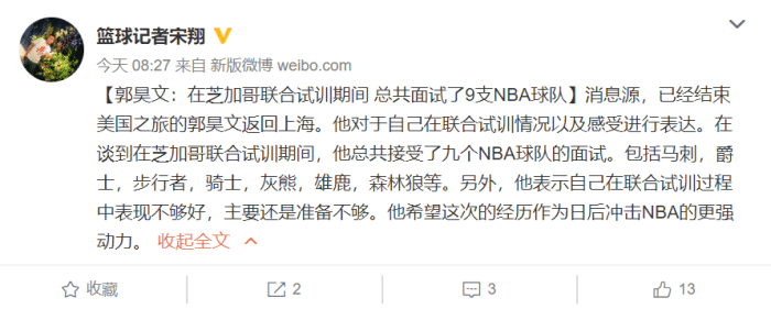 记者宋翔爆料“他在谈到在芝加哥联合试训期间,他总共接受了九个NBA球队的面试。包括马刺,爵士,步行者,骑士,灰熊,雄鹿,森林狼等。”郭昊文自己也承认,在联合试训中表现不够好,自己的准备不足,面试过程中认清了自己的差距!