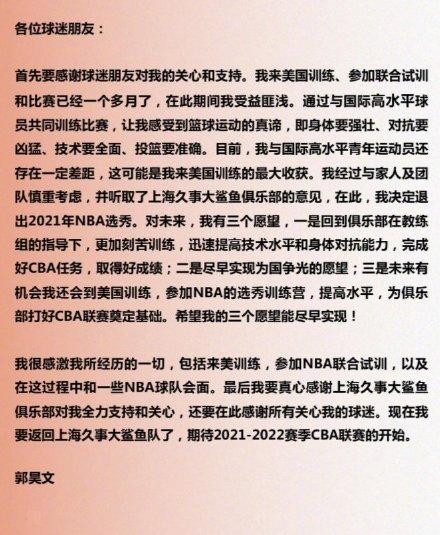 360直播讯北京时间7月8日,郭昊文正式宣布退出NBA选秀,并且在个人社媒上发长文回顾了此次参加联合试训的经历,感受到了自己与NBA的差距!