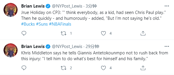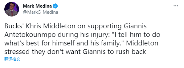 对于字母哥受伤的情况,米德尔顿表示:我告诉他要为自己和家人做最好的事情;米德尔顿还强调他们都希望字母哥不要太急于复出;米德尔顿还表示要在总决赛打出最好的状态。