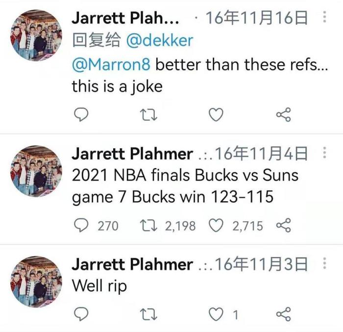 更加神奇的是,早在2016年,美国一名叫做Jarrett Plahmer的网友就曾经预测过2021年总决赛会是太阳vs雄鹿,他甚至给出了最终的预测结果,他认为雄鹿会在抢七大战中以123-115战胜太阳夺取总冠军。不得不说,这真是一个神奇的预测。