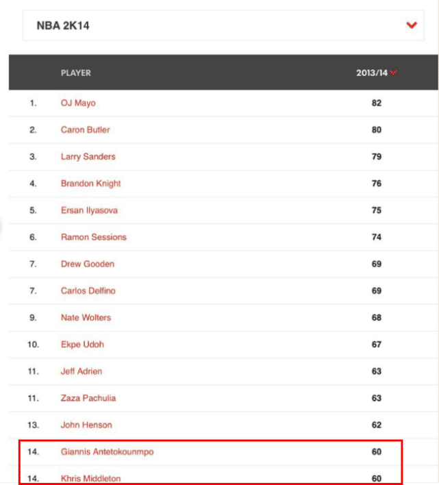 360直播讯 7年前,也就是2013-14赛季,雄鹿当时队内的15位球员里,现在只剩两位还留在这支冲进总决赛的球队中。这两位就是字母哥和米德尔顿。有趣的是7年前,两人的2K14的数值同为60分,在雄鹿队内一起垫底。