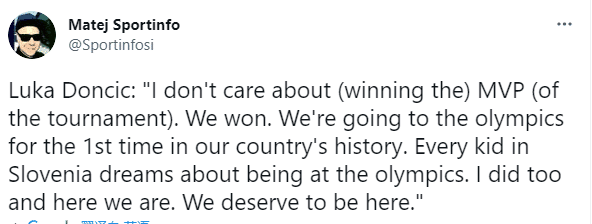 赛后谈到获得奥运参赛资格,东契奇表示:我不在乎赢得落选赛MVP;我们赢了,我们将要参加奥运会,这是我国历史上第一次;斯洛文尼亚的每个孩子都梦想着参加奥运会,包括我在内,我们做到了,这是我们应得的。