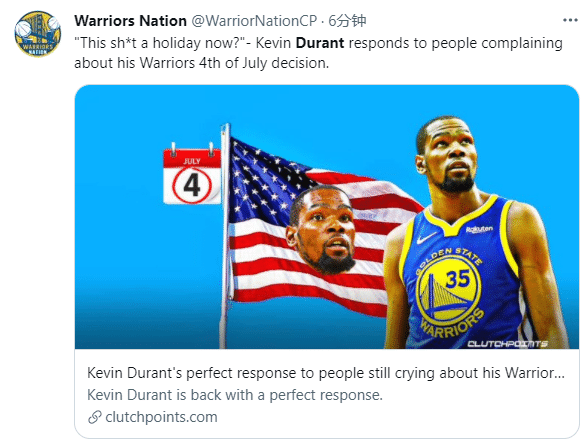 不久前球迷评论杜兰特5年前加盟勇士的决定,发推抱怨:直到今天仍旧有人为此哭泣,庆祝吧杜兰特;对此杜兰特用大号强势回应:现在,这特么变成一个节日了吗???