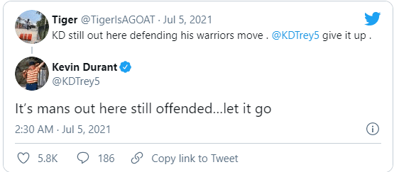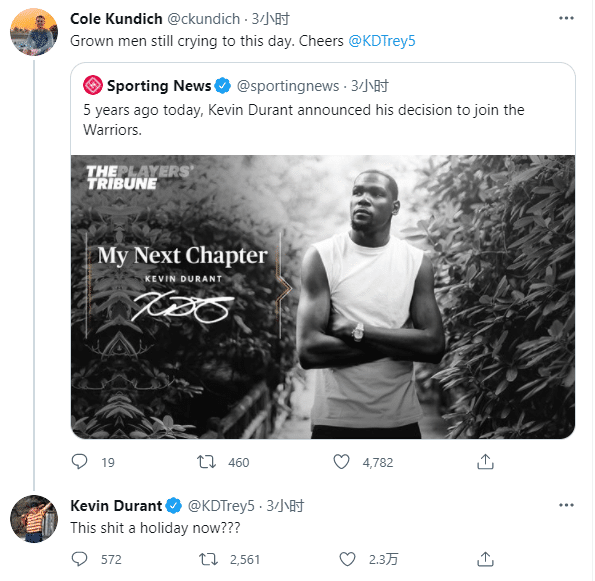 另有球迷发推:杜兰特仍旧在这里捍卫自己加盟勇士,KD放弃抵抗吧;杜兰特回应:这里仍旧有人很生气,还是算了吧。