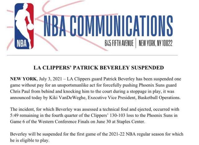 360直播讯 北京时间7月4日,NBA官方宣布,由于在西决G6中推倒太阳队后卫保罗,快船后卫贝弗利将被无薪禁赛一场。禁赛将在2021-22赛季的首场比赛执行。值得一提的是这竟然是贝弗利生涯首次被联盟禁赛,此前他曾五次被联盟罚款。