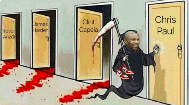 美媒的图片上,塔克版的“死神”挂着一双球鞋,扛着一把镰刀,挨个敲开大门。前三个大门上,分别写着特雷沃-阿里扎、詹姆斯-哈登、克林特-卡佩拉,而他正在敲响的大门上写着“克里斯-保罗”。