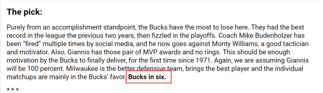 曾经的火箭首发五虎,如今各奔西东,都已经离开了休斯顿。塔克离开火箭后加盟雄鹿,他的球队在首轮横扫阿里扎效力的热火,次轮4-3险胜哈登所在的篮网,东决4-2淘汰卡佩拉效力的老鹰。总决赛上,他将和保罗对上。NBA官网对总决赛做出预测,他们认为雄鹿最终将以4-2的总比分淘汰太阳夺冠。换言之,NBA官网看好的是塔克继续他的“淘汰前队友之路”,而下一个被淘汰的是保罗。