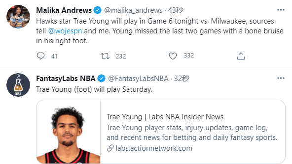 此前老鹰宣布特雷-杨因伤出战成疑,G6赛前则是确定为赛前决定是否出战,经过一番测试之后,最终老鹰宣布吹杨可以出战东决第六场;吹杨带伤复出,由于系列赛2-3落后陷入绝境,老鹰领袖提前复出,带伤与队友一起上场厮杀。