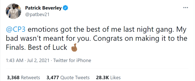 比起快船其他球员,贝弗利提前几分钟结束了自己的赛季,当时他懊恼地脱掉了自己的球衣。经过几个小时的冷静,贝弗利更新社媒,为自己的冲动向保罗道歉。