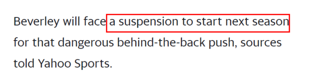 360直播讯 北京时间7月2日,据NBA记者克里斯-海耶斯报道,由于在西决G6故意推倒保罗,贝弗利将被联盟禁赛。快船的赛季已经结束,因此,禁赛处罚将在下赛季开始后生效。