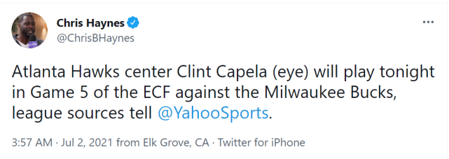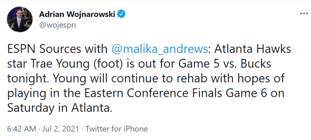 特雷-杨因G3踩在裁判脚上受伤,缺席了G4的比赛,他也无法出战G5的比赛,美媒报道称他将继续养伤,争取G6复出。老鹰的卡佩拉在G4中眼部受伤,他可以出战G5的比赛。一天前,老鹰将两人的出战状态都列为questionable,也就是50%的上场概率,如今,杨无法复出,卡佩拉能够出战。