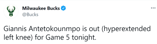 360直播讯 北京时间7月2日,雄鹿官方宣布,字母哥因左膝过度伸展的伤势,将缺阵今日的天王山之战。老鹰一方,眼部发炎的卡佩拉已经确定可以出战,特雷-杨继续养伤,不会出战今天的比赛。